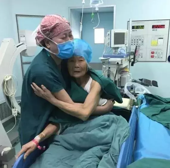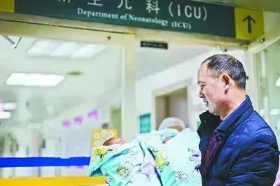 护士抱着一对龙凤胎亲了亲母亲的脸颊