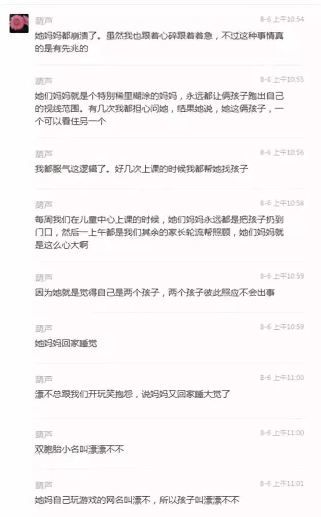 有人认识这次“青岛溺亡双胞胎”的妈妈,并发帖指出“每周我们在儿童中心上课的时候,她永远都是把孩子扔到门口,然后一上午都是我们其余的家长轮流帮照顾,就是这么心大啊。