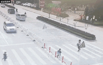 2018年3月14日,在广西乐业县的一个路口,一位妈妈带着两个孩子过马路,孩子在她前面跑,她提着包、低着头刷手机,跟在后面“看着孩子”,结果孩子被一辆汽车撞飞在地。