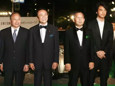 麻生太郎(左二)与《赤壁》主创 来源:网络