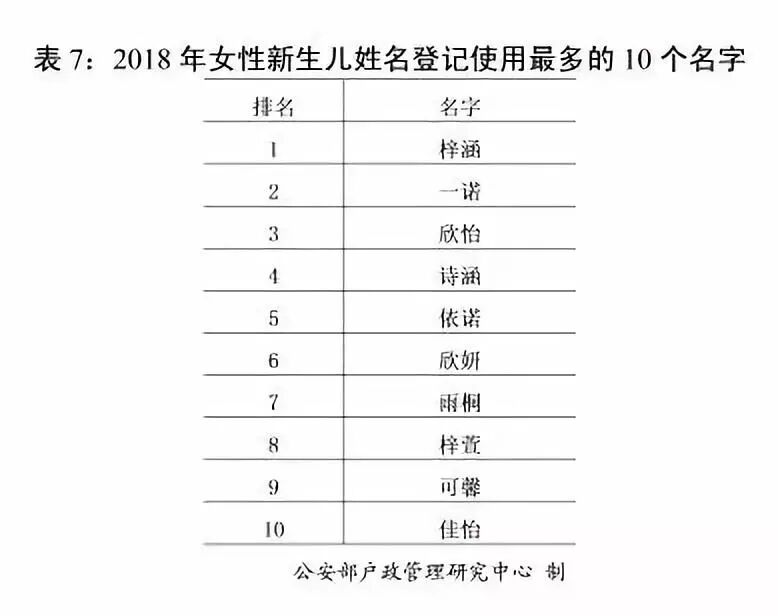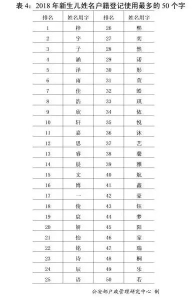 在登记的新生儿名字中,公安机关统计了使用频率最高的50个字为“梓”、“宇”、“子”、“涵”、“泽”、“雨”、“佳”、“浩”、“欣”、“轩”等。