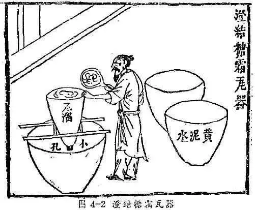 明朝《天工开物》记载:福建和广西将过冬成熟的甘蔗,榨成汁,盛入缸中,然后用火熬,等到变成黄黑色的糖浆,倒入桶中凝结成黑沙糖。然后一口缸,上面安放一个瓦质漏斗,用稻草塞的漏口,将黑砂糖倒入漏斗中,等黑沙糖结成块,再去掉稻草,用黄泥水淋漏斗中的黑砂糖,黑渣从漏斗流入下面的缸中,漏斗黑砂糖就变成了白霜,最上一层约五寸多,非常洁白,就和我们今天吃的白砂糖一样。