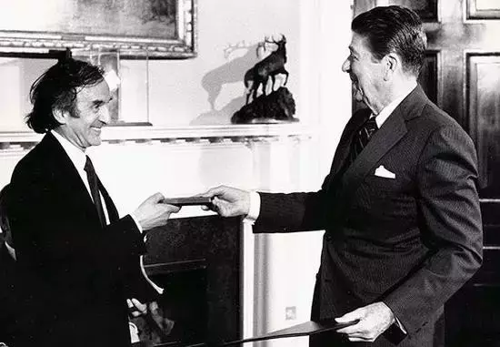 1986年10月14日,美国前总统里根向威赛尔颁发美国国会荣誉勋章。