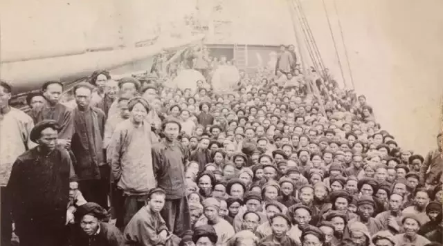 图为19世纪末从厦门港出发被运往海外的契约华工。