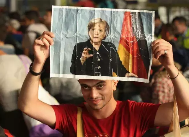 成千上万的移民途径匈牙利和奥地利抵达德国,来自叙利亚的难民手举德国总理默克尔的照片。