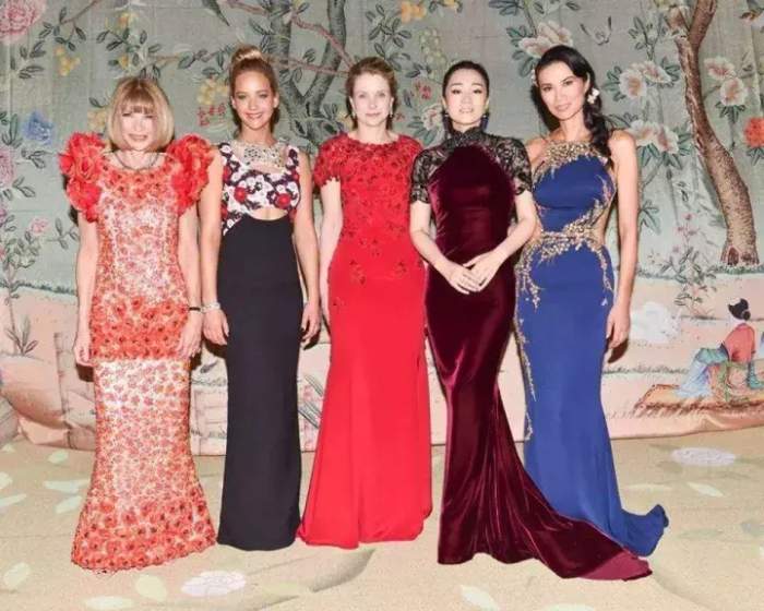 正中间是梅耶尔,和珍妮弗.劳伦斯、巩俐这样的美女合照,颜值、气势一点也不逊色