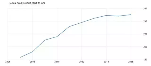 日本政府债务飙涨,政府举债投资是“安倍经济学”重要内容之一(来源:tradingeconomics.com)