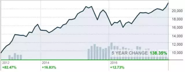 股市有“经济晴雨表”之称,日经指数从2012年以来,翻了一番还多。(来源:money.cnn.com)