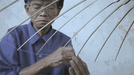 一把伞要经过几十道工序,材料就是竹子、纸张、棉线;插入一根竹条,就能做成弹簧;涂上菜籽油便可防水;抹上锅底灰和特别的植物制成的颜料,伞面变得古朴动人。