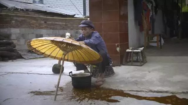 所有这些都是凭几十年的感觉。几年前,傣族油纸伞被媒体报导时,村子里还有四位老人会做伞。如今,只有坎温老人一位了。无论是否有人买,坎温每天都这样靠墙坐着,默默地做着他的伞。他的妻子,79岁的温扁是他的助手。