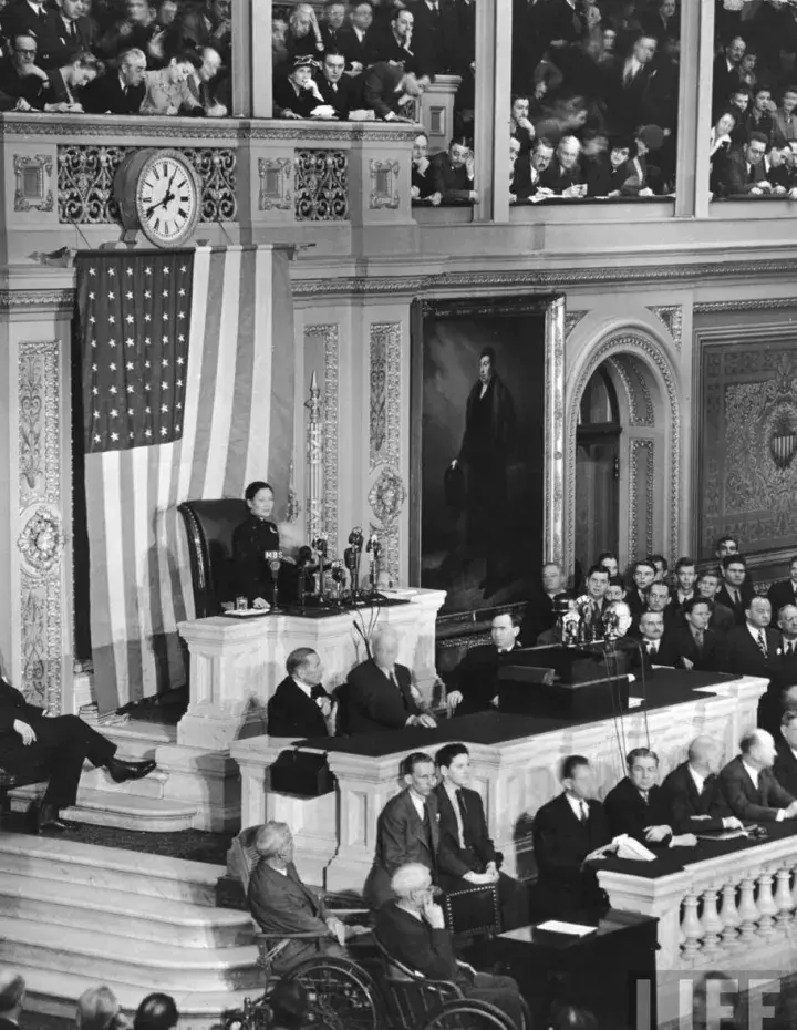 当时,议员和旁听席上皆座无虚席,国会议员们凝神聆听宋美龄演讲。