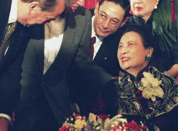 1995年,美国华盛顿,美国国会特意为她举办庆祝二战结束50周年的酒会,接近百岁高龄的宋美龄发表了演讲