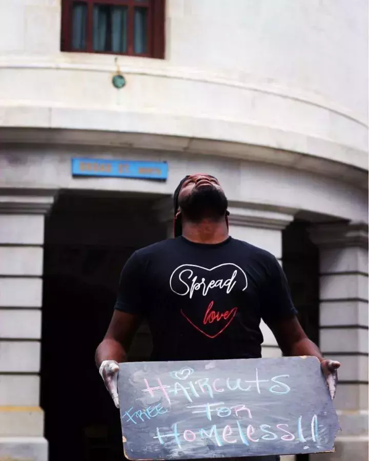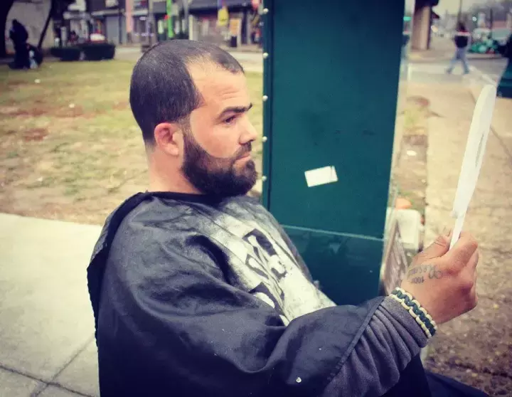 1月15日,一个天气晴朗的星期天,琼斯第一次走上街头。找了块黑板,用粉笔写上“为无家可归者理发”,拿着简单的理发工具,流动理发摊支起来了。第一天,他只找到三位愿意理发的流浪汉。理发时,他拍摄了小视频上传到脸书。次日,点击率突破240万。