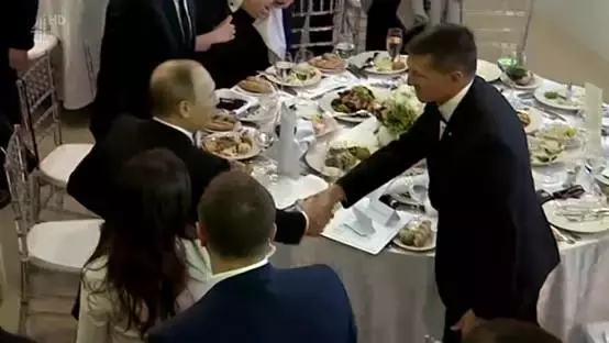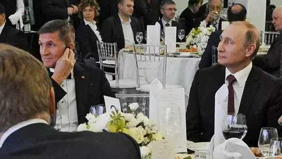 下图中左边的这名男子,后来成为特朗普总统的国家安全事务助理。2015年12月在莫斯科举行的一次晚宴上,他就坐在普京身边。