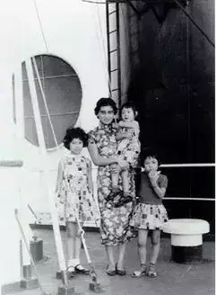 朱木兰带着三个女儿在从台湾航行到美国的轮船在甲板上的留影