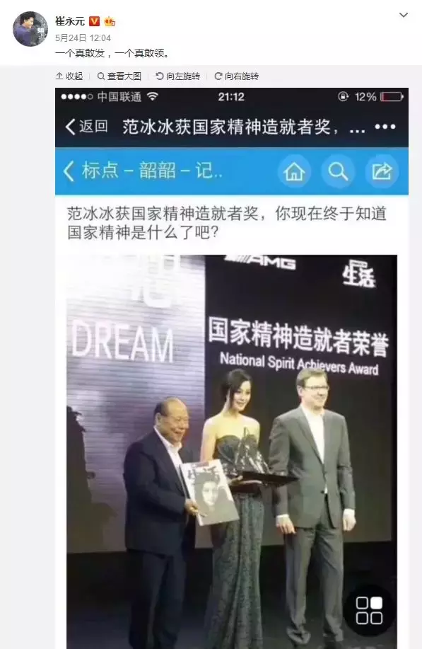 而此前针对范冰冰获得某企业颁发的“国家精神造就者”的荣誉,崔永元在微博中用语犀利,直击要害:一个真敢发,一个真敢领。