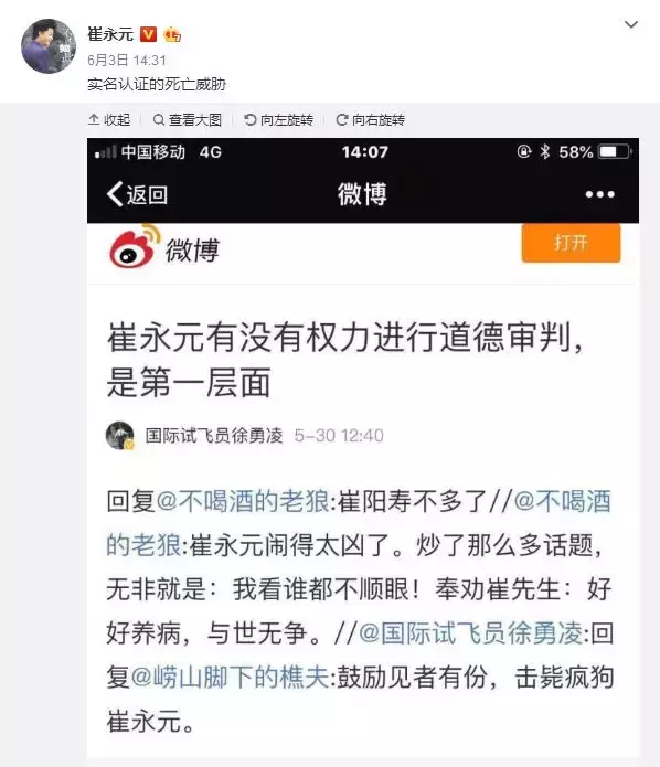 6月3日下午,崔永元发微博称,收到了实名认证的死亡威胁。
