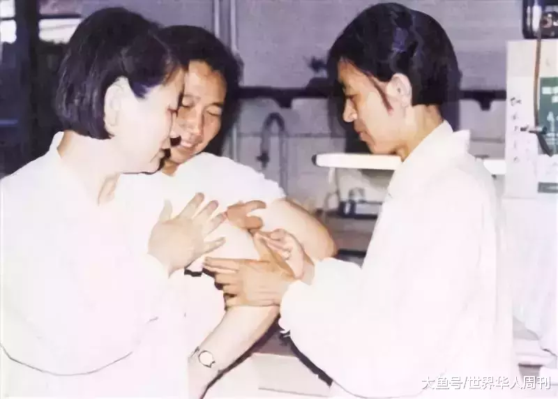1975年8月29日,陶其敏(左一)在自己身上实验肝炎疫苗