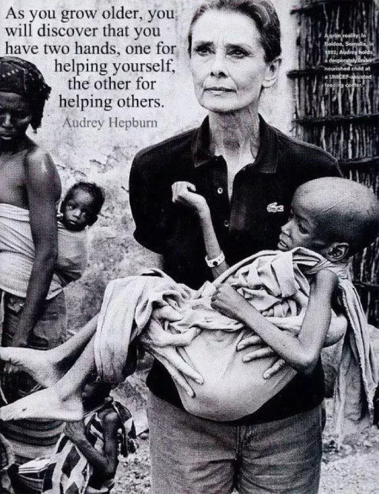 晚年的赫本,始终致力于慈善事业,她曾以重病之躯赴索马里看望因饥饿而面临死亡的儿童。