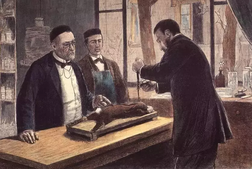 巴斯德大胆地从病死的兔子身上取出了一段脊髓,然后把这段脊髓放在一支无菌烧瓶之中,确保环境真空无菌,随后他发现,没有干燥的脊髓是极为致命的,破坏性非常强。把干燥过后的脊髓研磨成粉末之后再和蒸馏水混合,把这种东西注入到健康的犬只体内,狗必死无疑。相反的,将干燥过后的脊髓和蒸馏水混合注入狗的体内,狗经过一段时间之后竟然神奇地活了下来。