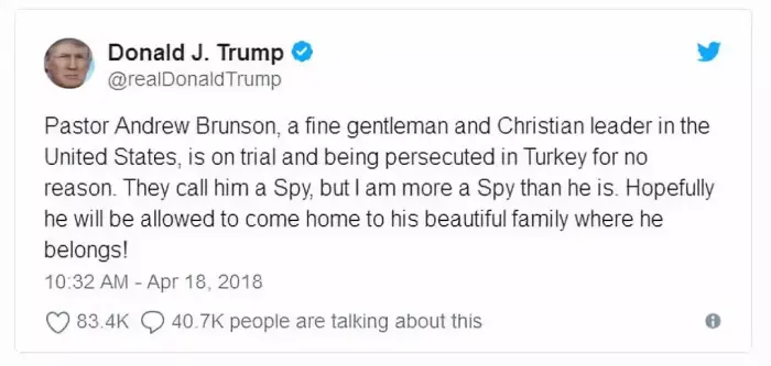 4月18日,特朗普发言力挺这位牧师,他说安德鲁•布伦森是位优秀的牧师、基督教的领袖,在土耳其遭受的都是平白无故的陷害,还说“他们说布伦森是间谍,但我比他更像间谍!”,并要求释放安德鲁,让他尽快返回美国。