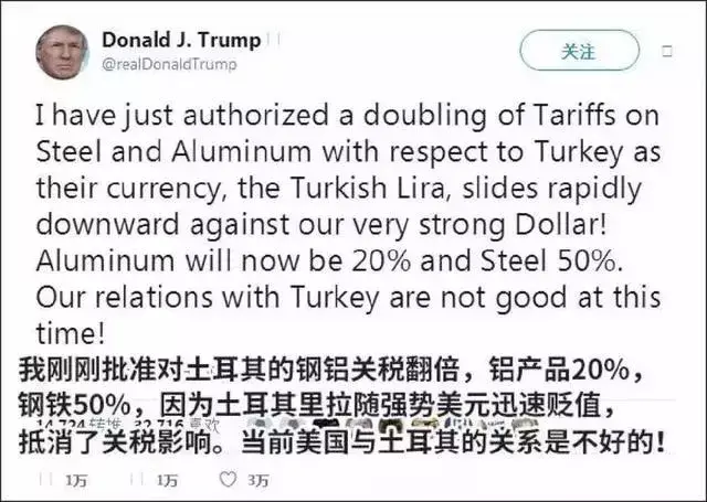 土耳其本来可供出口的商品就不多,拿得出手的是钢铁,也是全球第八大钢铁生产国,美国是他最重要的出口国,此番美国提高关税,就像是掐住了土耳其的命门。