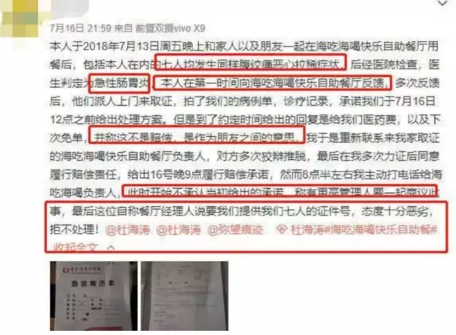 后来,杜海涛的“海吃海喝”自助餐厅霸占了微博热搜榜长达3天,原因是7位顾客用餐过后导致腹泻就医,而餐厅方面竟然称是顾客是在“碰瓷”。