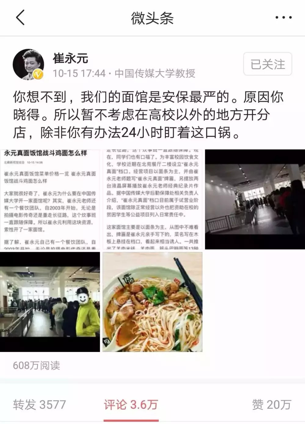 那么问题来了,崔永元为什么要开一家赚不了钱的面馆呢?