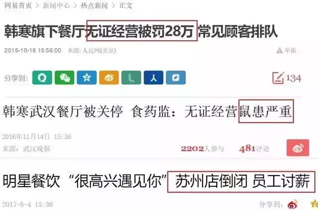 两年后,该店倒闭,转让给了“外婆家”,原来,韩寒的餐厅没有扛得住价格虚高,无证经营,接连曝出负面新闻,仓库货架顶部全是老鼠屎、员工私人物品乱放、员工不戴手套徒手制作食物、食用油重复利用炸到发黑,最终,关门大吉。