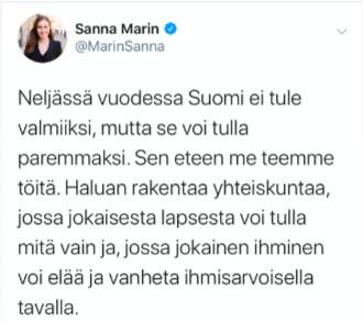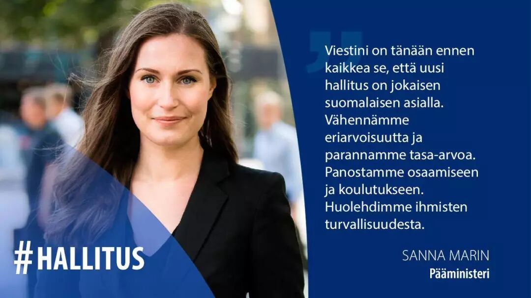 12月10日,马林在推特上发表了一篇文章,说未来执政四年里,自己将致力于在芬兰建设一个更好的社会,气候变化、平等和社会福利是她的首要议程。