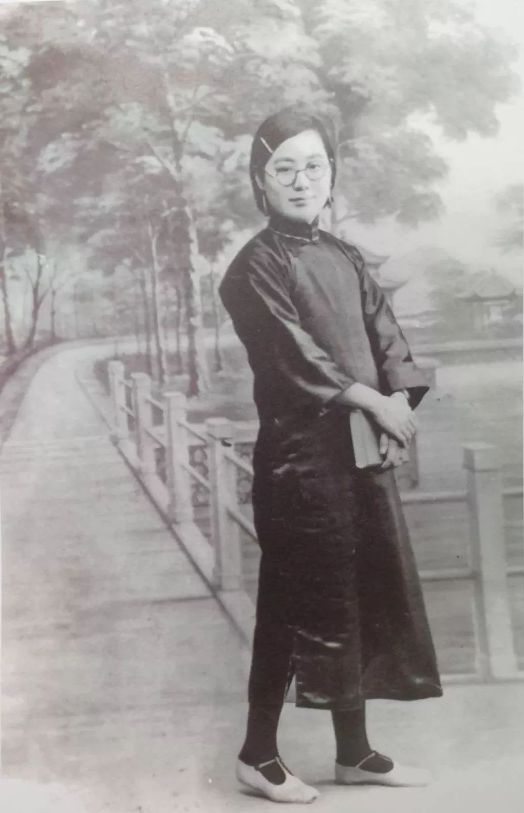 一身黑缎旗袍,长长的白丝围巾,围着脖子闲搭在肩后。玳瑁黑边眼镜,衬出白皙的脸蛋。一脚在身后微微踮起,脚尖仍然点在地上,半转身微笑着,要走又走不了的样子。