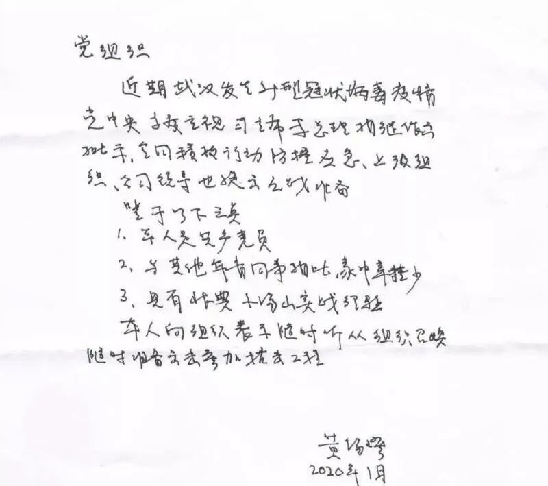 “鉴于以下三点:本人是共产党员;与其他年轻同事相比,家中牵挂少;具有“非典”小汤山实战经验。本人向组织表示,随时听从组织召唤,随时准备出击参加抗击工作。”