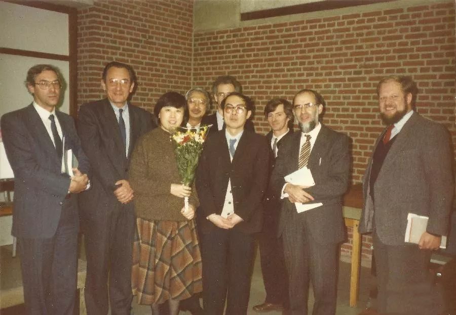 ▲1987年11月,黄锡璆(右四)在鲁汶大学博士论文答辩后与导师等合影