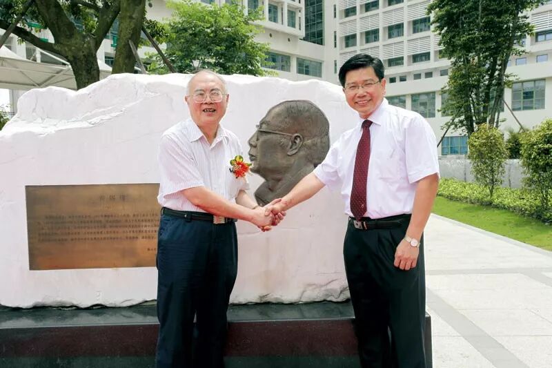 ▲黄锡璆和佛山市第一人民医院原副院长谭伟堂在铭石前合影留念