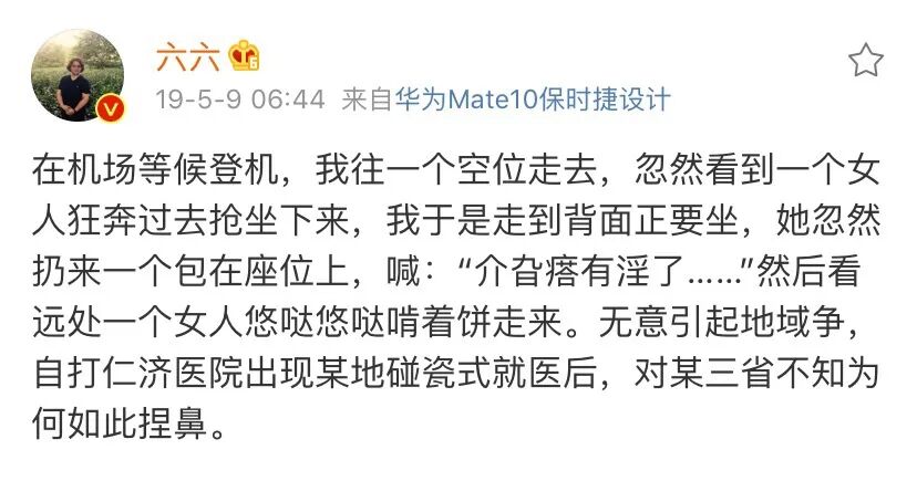 去年,六六写自己在候机的过程中,被一名狂奔过来的女子霸占了原本想坐下的座位,对方以浓重的地方口音宣告“领土”主权:“介旮瘩有淫了!”