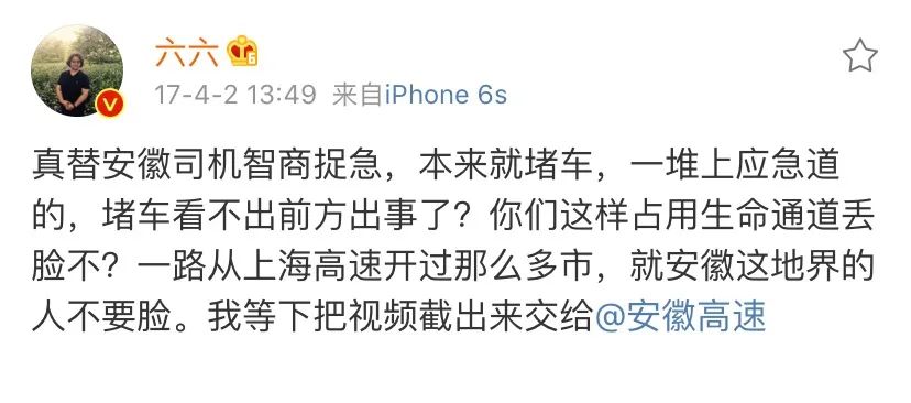 2017年,六六因为安徽司机占用应急道而开骂:“一路从上海高速开过那么多市,就安徽这地界的人不要脸”!