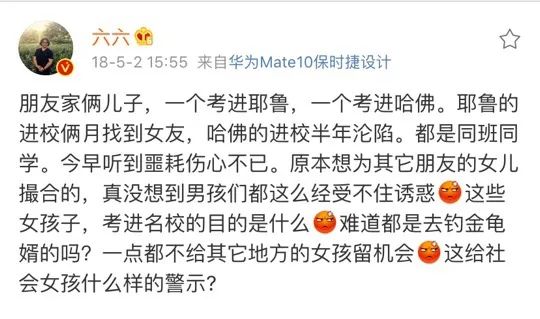 除此之外,六六老师另一番“石破天惊”的言论则是“女生考进名校就是为钓金龟婿”之说。