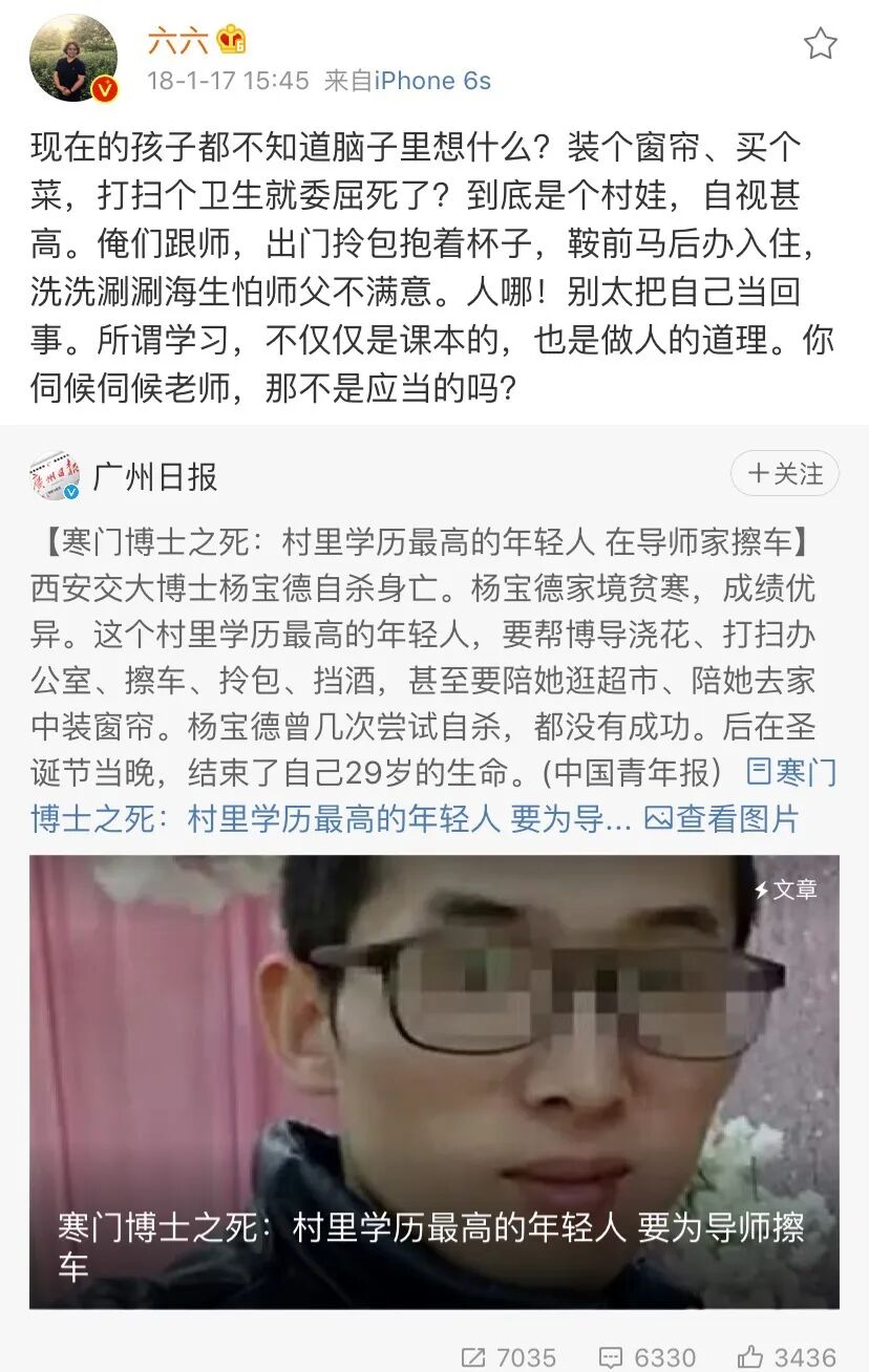 就在网友对自杀博士的遭遇唏嘘不已时,六六也在微博上发表了看法,她转发了《寒门博士之死:村里学历最高的年轻人要为导师擦车》一文,并评论道: