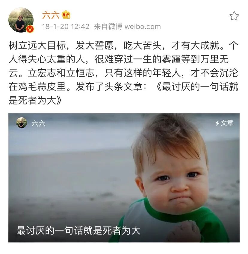 正当舆情汹涌,有关方面彻查此事之时,六六再次“语不惊人死不休”,又发表了一篇《最讨厌的一句话就是死者为大》。