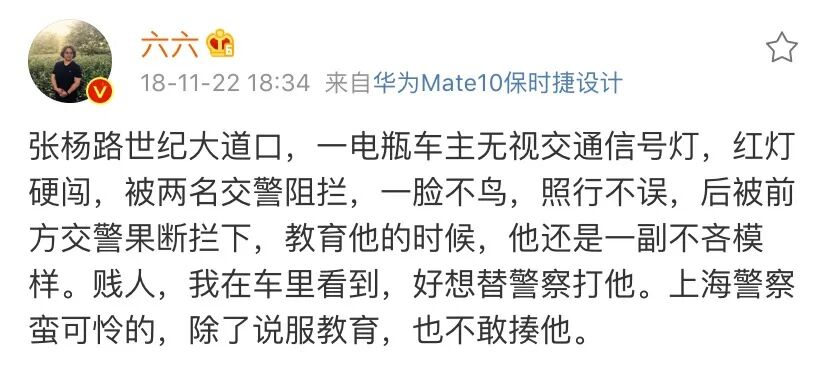 即便定居上海,六六也敢于在“地域黑”上“大义灭亲”。她曾在微博上写一电瓶车主无视交通信号,闯红灯的事,遂爆粗怒骂车主,同时也被她上升为地域问题,称“上海警察蛮可怜的”。