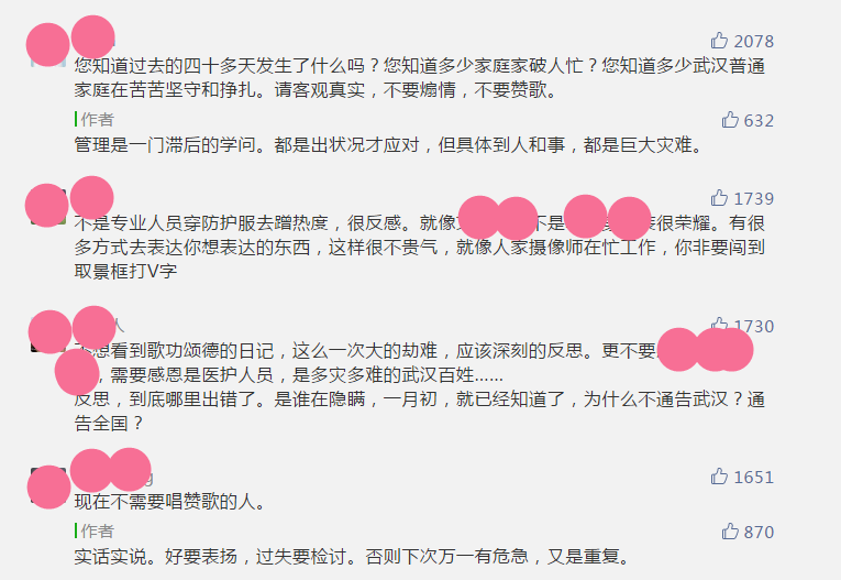 有武汉人看到这样的文字留言称,我们自己有嘴,有笔,有数,不需要“不相干”的人来替我们记录。