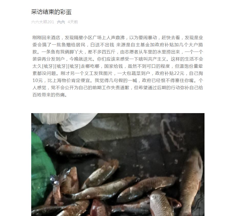 在 六六的文章里,“彩蛋”之喻是说采访结束后,发现隔壁小区业委会搞了一批鱼赠给居民,故谓之“彩蛋”。