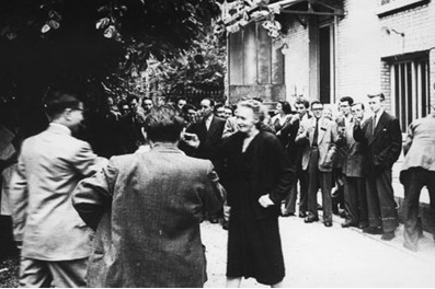 ● 1951年6月,伊雷娜·居里(左三)在杨承宗(左一)毕业论文通过后开庆祝酒会