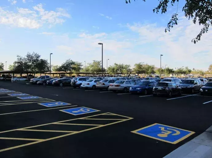 在美国,残疾人也可以开车,并且在公共场合拥有最大的便利。在酒店、学校等地的停车场,残疾人的车位都比一般人的要大很多,位于最方便停靠的地方,并且严格禁止其他人随便占用。