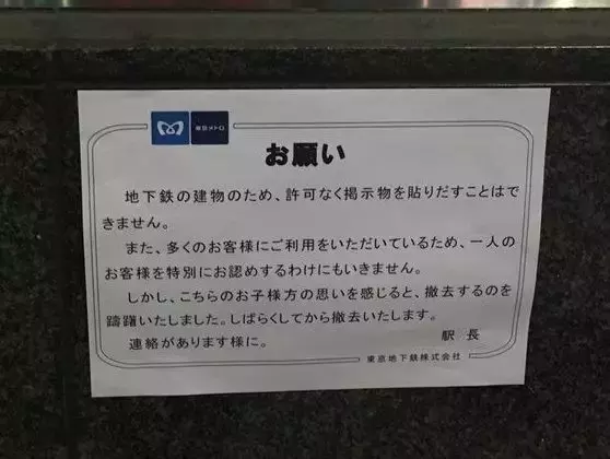 而今年9月,东京王子地铁站的站口,有一张违规的广告在那里张贴了很久,非但没有被工作人员撕下来,还获得了站长的保护。