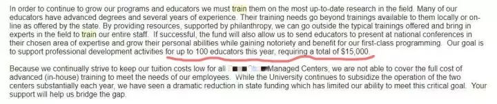 比如,像这个Daycare募捐信里就会说,需要多少钱,给谁用,多少人,怎么用。