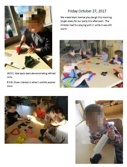 其次,Day Care infant/toddler班的规模一般是一个班16个学生、4个老师、外加1个流动巡查老师。老师每天会发newsletter给班级每位家长,告诉大家今天老师带领孩子们做了什么、目的是什么?并附上一些照片,让家长清楚孩子的情况和教学目标。而孩子每天在Day Care的饮食情况、换尿布情况、睡眠情况都会有书面记录,方便家长查阅了解。