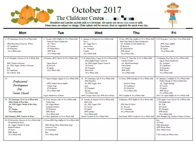 另外,每个月底老师会把Day Care的菜单发给每位家长,上面罗列了厨房每天提供的三餐食物和小吃,让家长把孩子爱吃的和愿意尝试的食物选出来,确保孩子营养均衡。