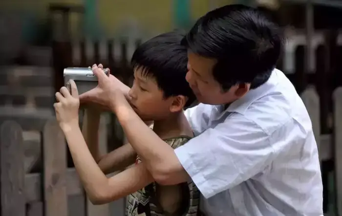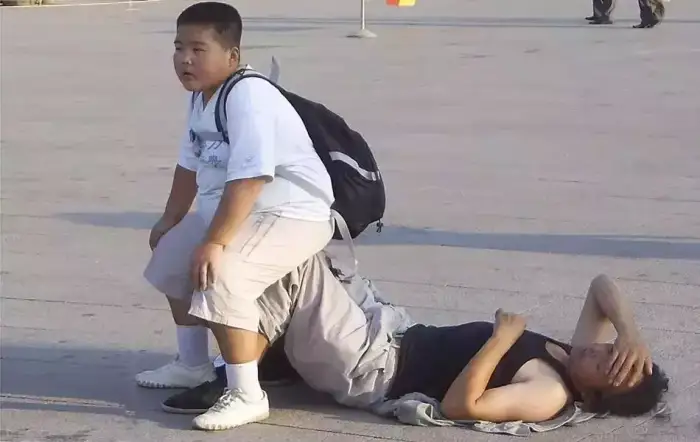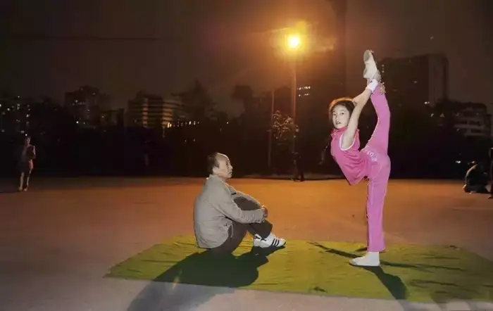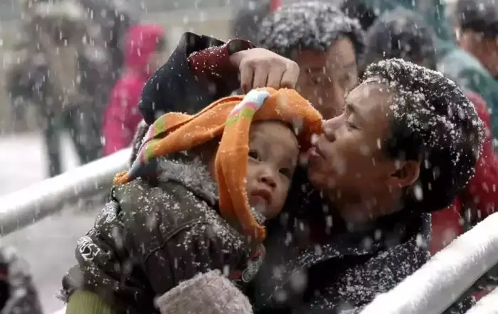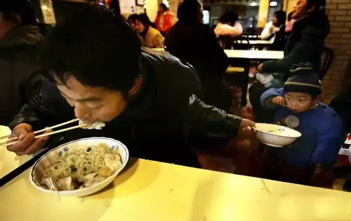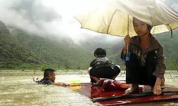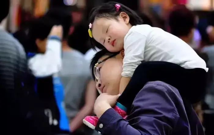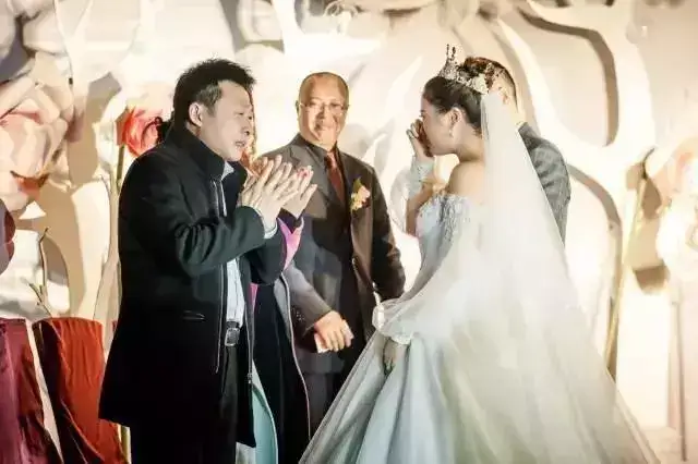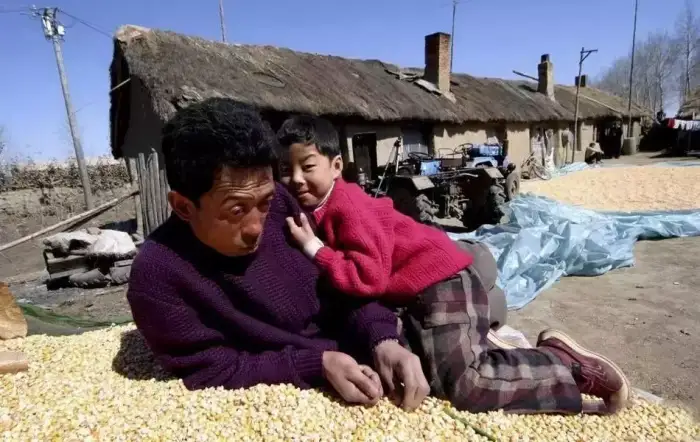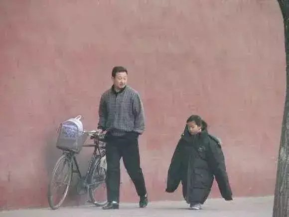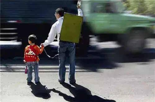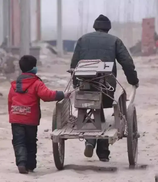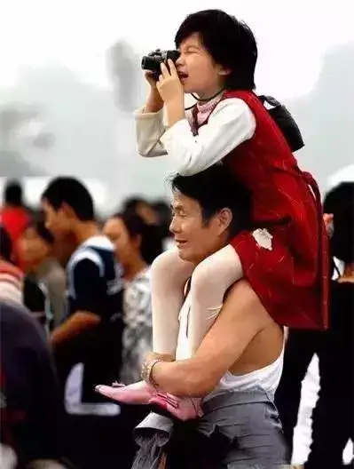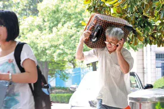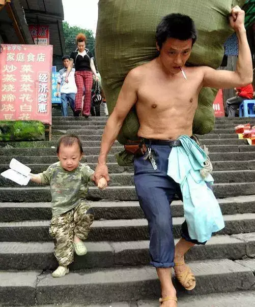白发苍苍的父亲肩扛沉重的行李在后面跟随,