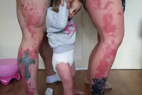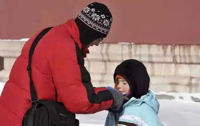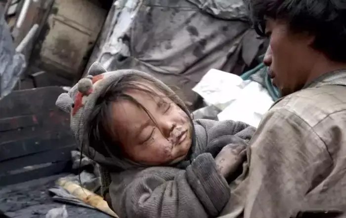一位父亲将在煤炭上睡着的孩子抱回窝棚。